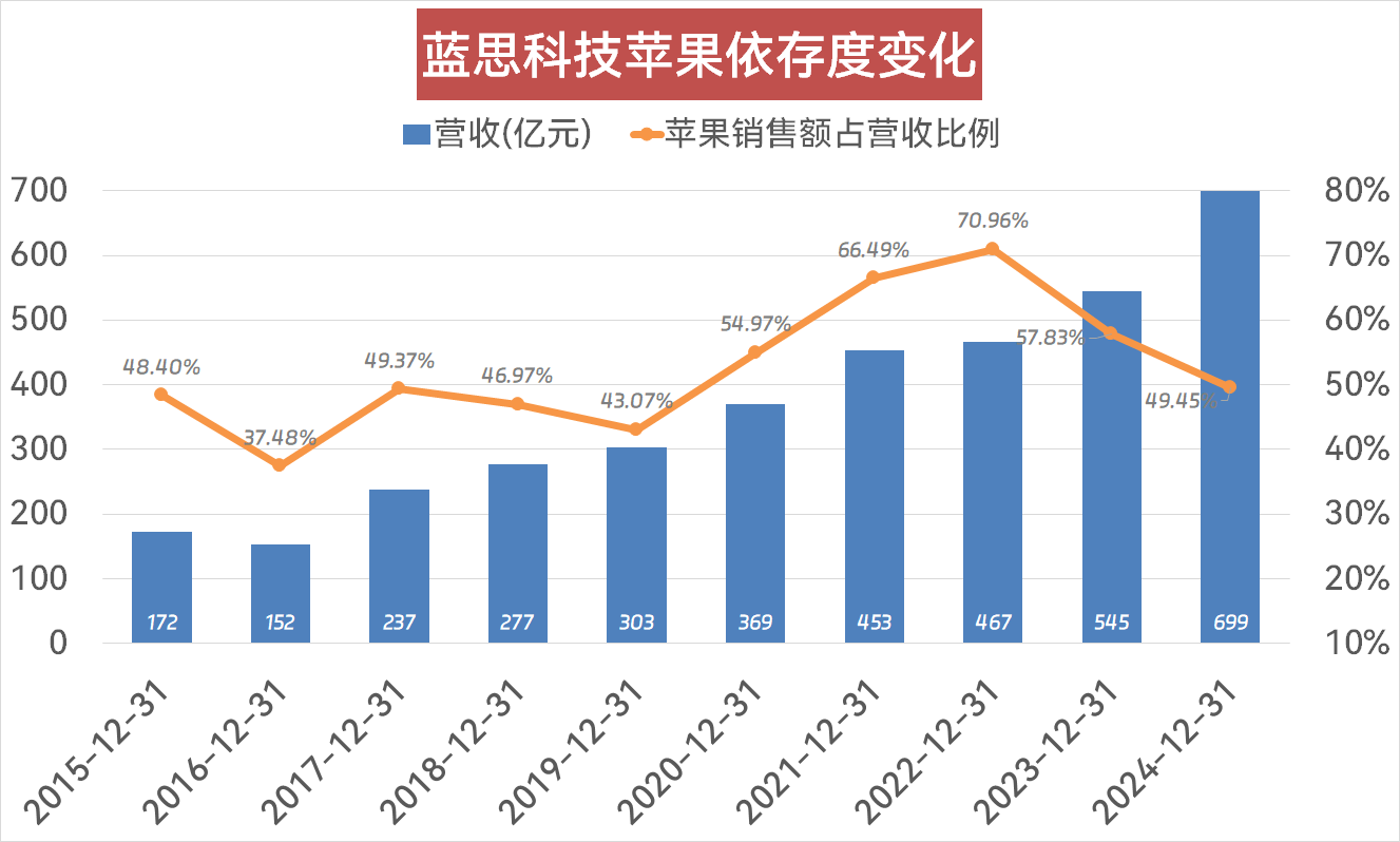 做为苹果公司焦点供应链企业,蓝思科技曾极端依赖这一单一客户——2022年苹果公司贡献的营收占比高达70%以上,2024年虽降至49。45%,但仍远超第二、三大客户营收占比。此外,汗青上iPhone销量波动多次间接激发蓝思科技业绩震动,2018年就曾因高通和iPhone销量下滑呈现单季度吃亏超4亿元的困境。