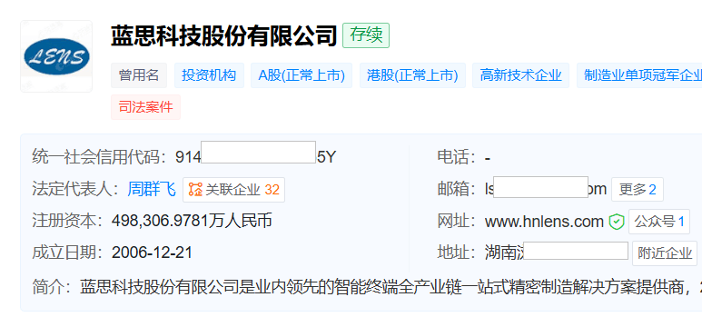 天眼查显示,蓝思科技成立于2006年12月,位于湖南省,2015年3月正在深交所创业板上市,2025年7月正在港交所上市。