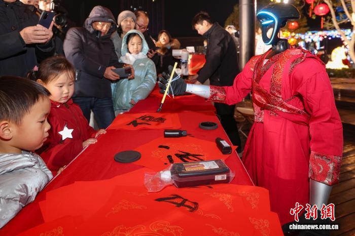 还有一群身穿定制节庆服拆,“文”妙手写对联,“武”能挥手贺年、跳舞互动的人形机械人,也悄悄成为城市的“新春巡逛顶流”,穿越于本地红山动物园、熙南里等文旅景区、地标项目,以互动巡逛和点位跳舞的形式,为旅客带来一场充满将来感的科技年味。